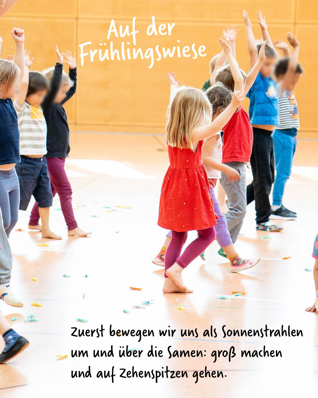 Zuerst bewegen wir uns als Sonnenstrahlen um und über die Samen: groß machen und auf Zehenspitzen gehen.