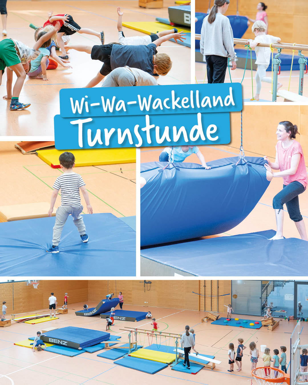 - Wackelberg: auf eine Weichbodenmatte klettern, deren Schlaufen einer Seite an den Karabinern zum Einhängen von Schaukelringen aufgehängt ist. Abspringen auf eine zweite Weichbodenmatte.