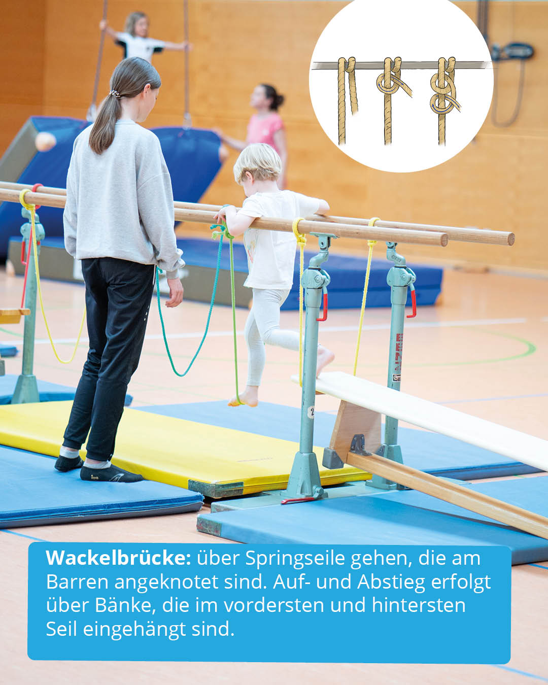 - Wackelbrücke: über Springseile gehen, die am Barren angeknotet sind. Auf- und Abstieg erfolgt über Bänke, die im vordersten und hintersten Seil eingehängt sind.