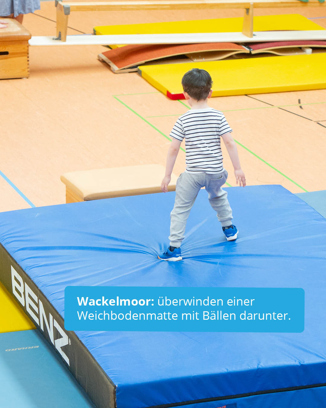 - Wackelmoor: überwinden einer Weichbodenmatte mit Bällen darunter.