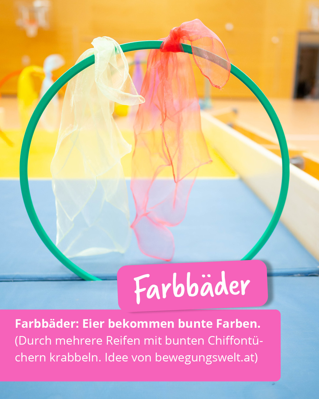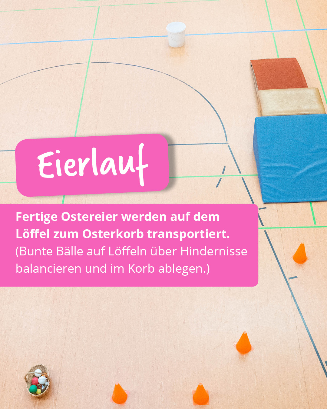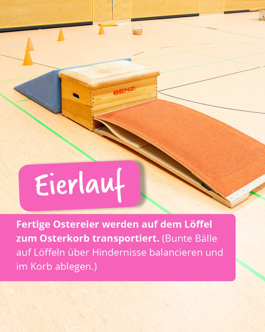 „Für das Osterfest müssen noch ganz viele Eier gefärbt werden. Das geschieht in der Ostereier-Fabrik.“ Im folgenden Parcours spielen die Kinder die Eier, die bunt gefärbt werden: