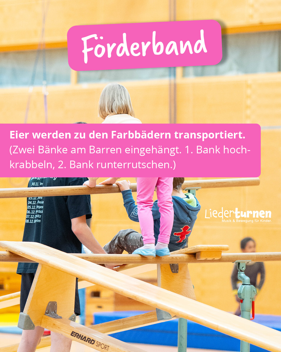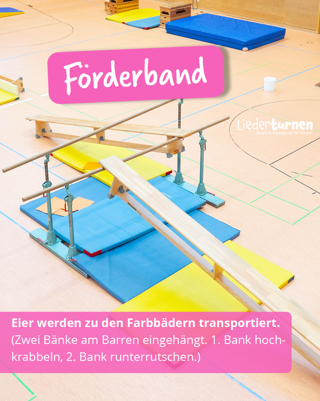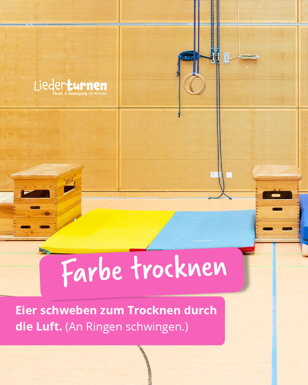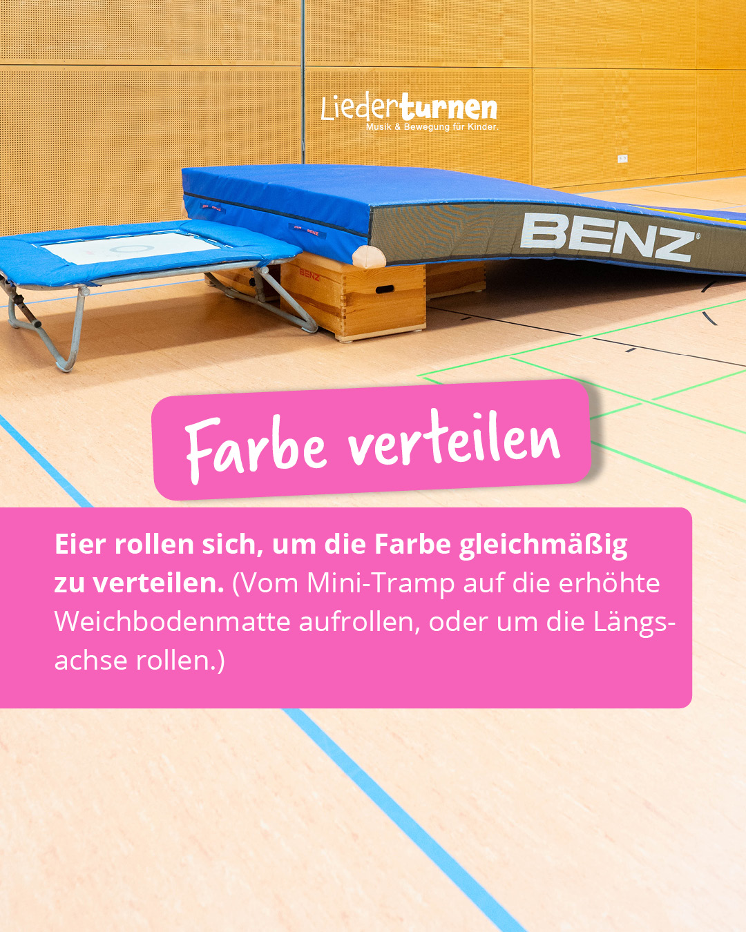 „Für das Osterfest müssen noch ganz viele Eier gefärbt werden. Das geschieht in der Ostereier-Fabrik.“ Im folgenden Parcours spielen die Kinder die Eier, die bunt gefärbt werden: