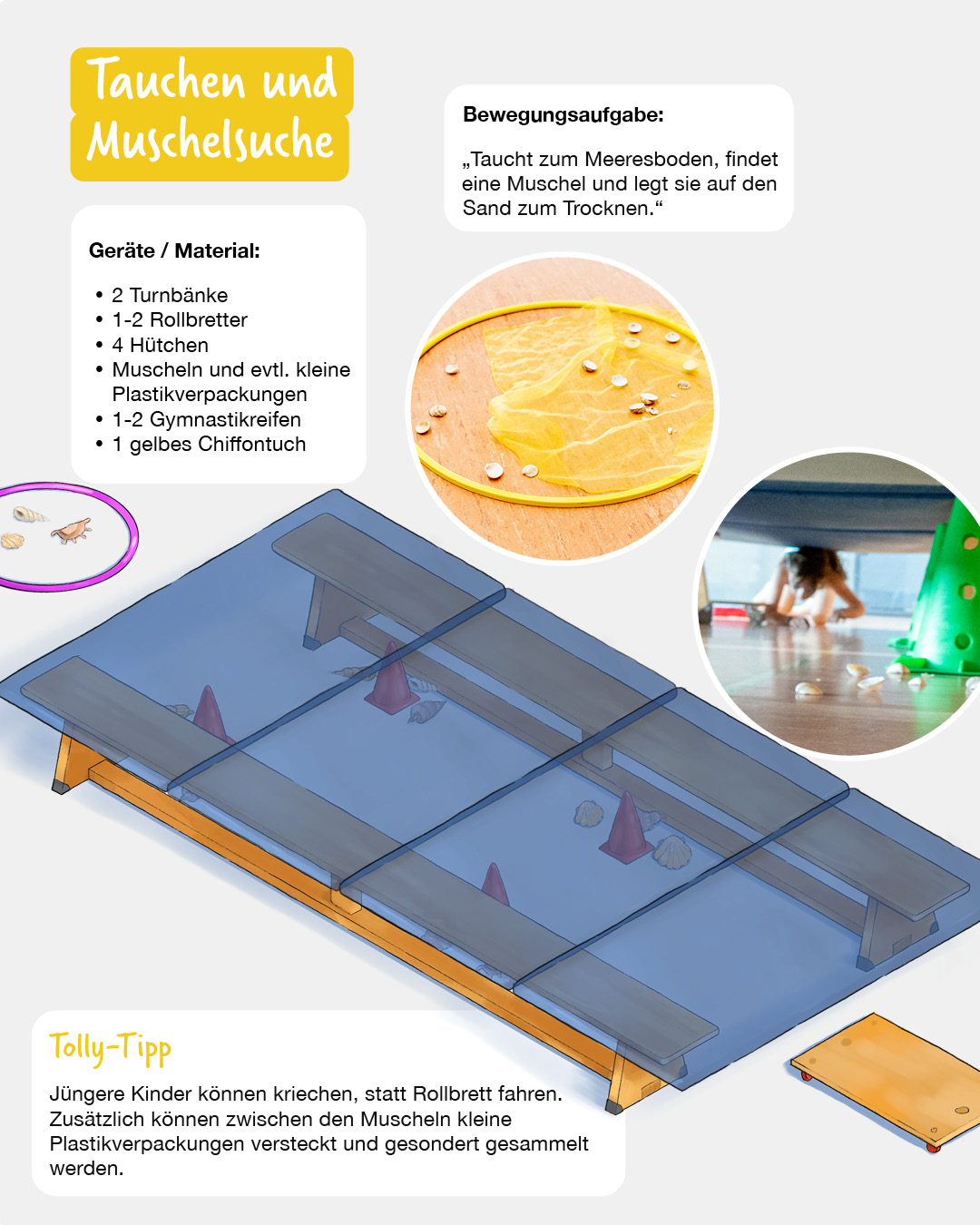 Jüngere Kinder können kriechen, statt Rollbrett fahren. Zusätzlich können zwischen den Muscheln kleine Plastikverpackungen versteckt und gesondert gesammelt werden.