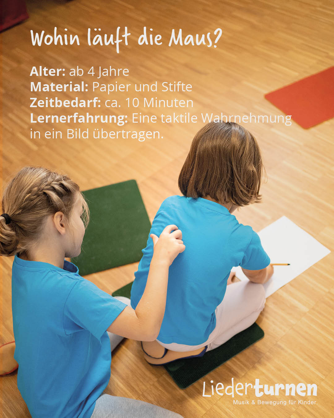 Beide Spielpartner knien hintereinander. Das hintere Kind zeichnet mit seinem Zeigefi nger langsam den Laufweg einer Maus auf den Rücken des Vorderen. Dieses Kind überträgt nun das, was es spürt, auf das Papier. Das „Mäuschen” sollte dabei nicht zu schnell über den Rücken laufen.