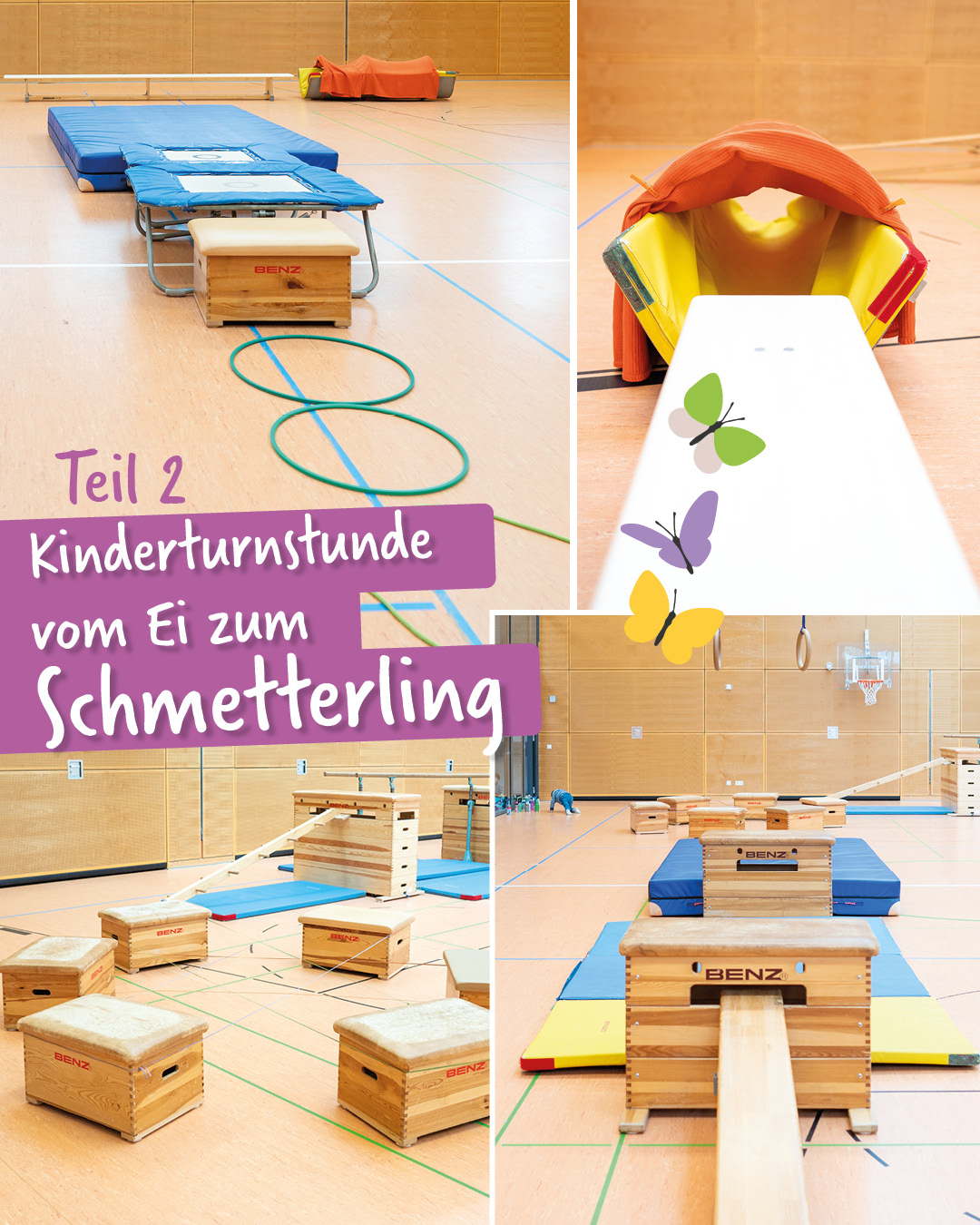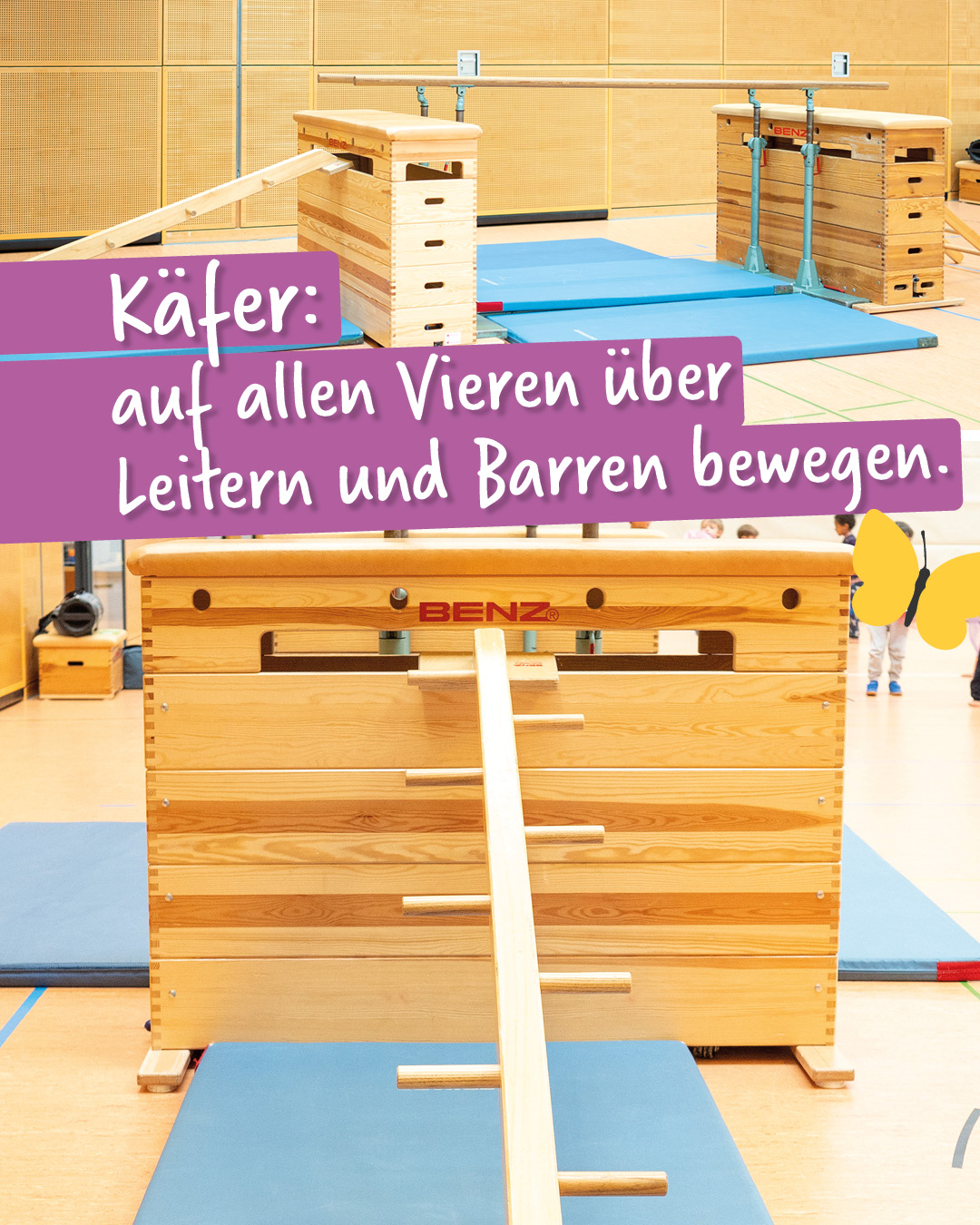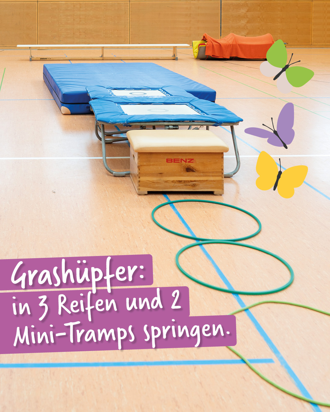 Bei den Turnstationen sind die Kinder verschiedene Tiere auf der Frühlingswiese.