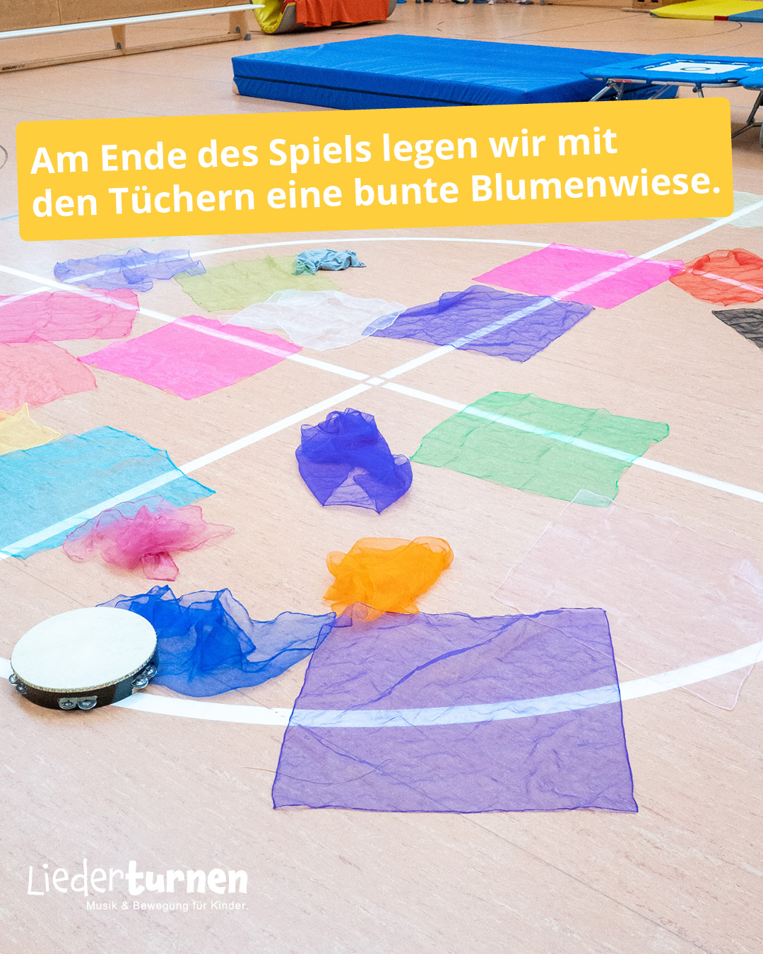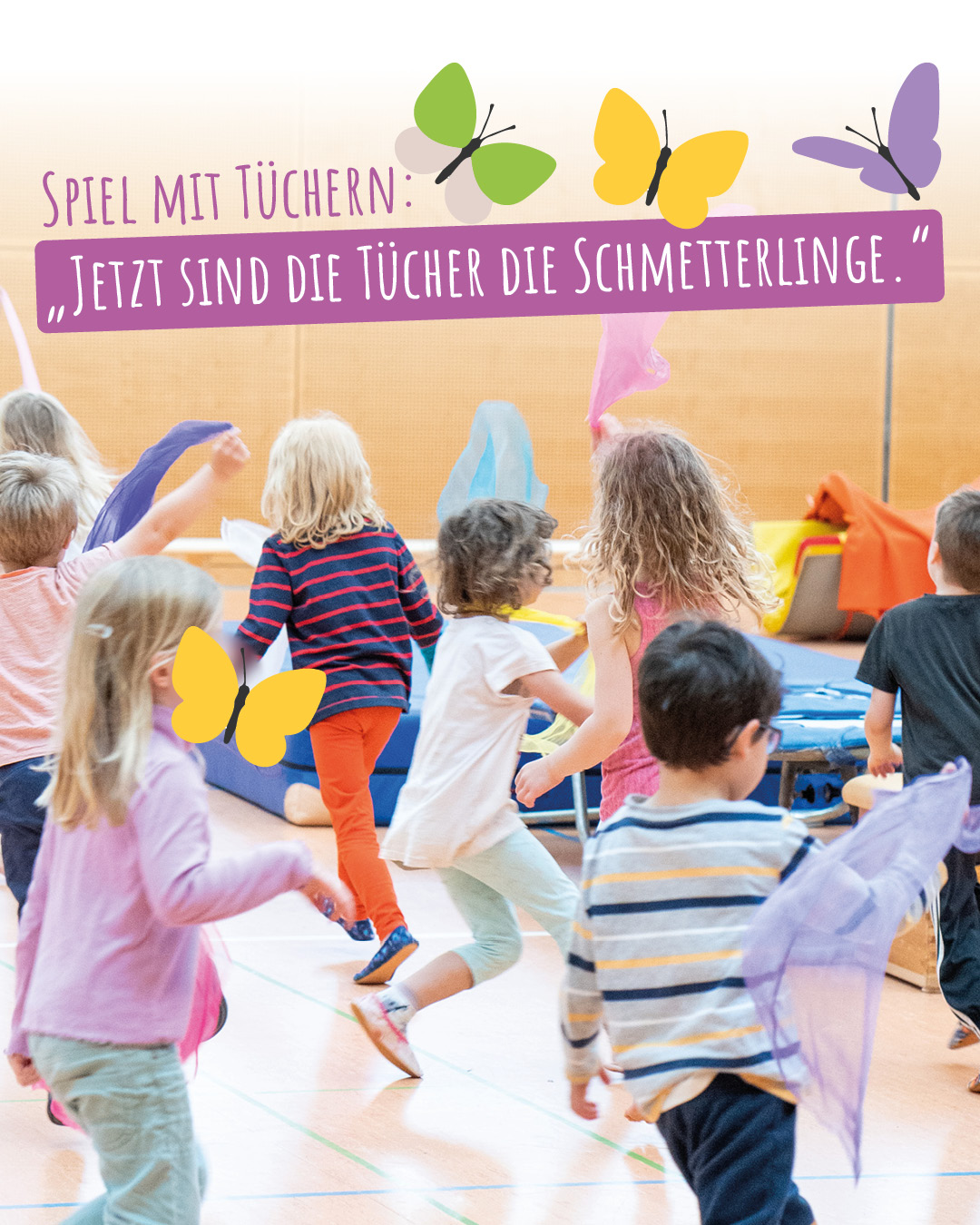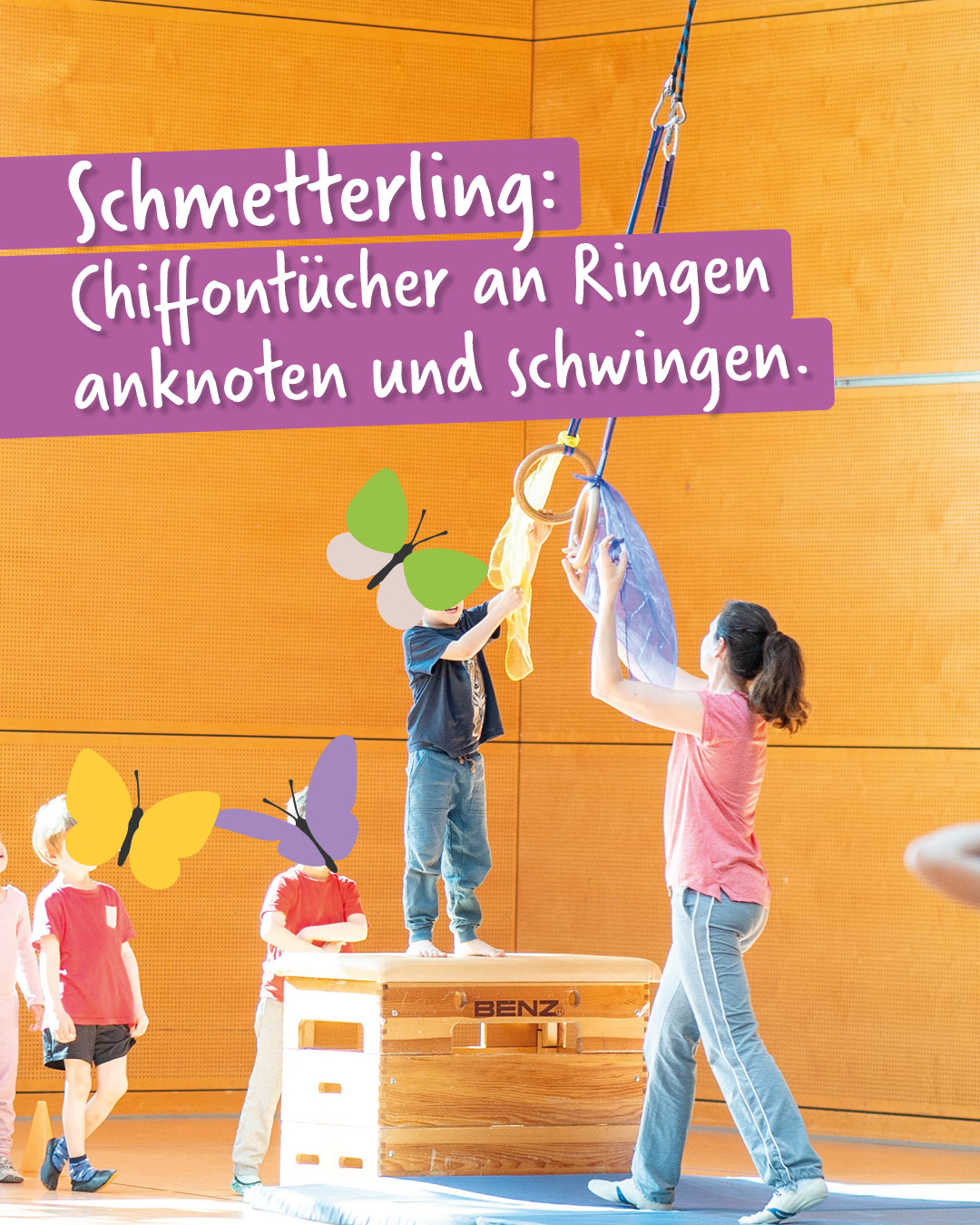 Bei den Turnstationen sind die Kinder verschiedene Tiere auf der Frühlingswiese.