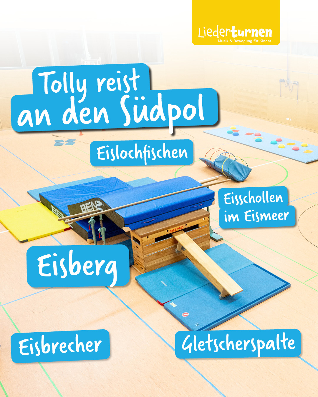 Die Kinder bringen ihre Ideen ein und es wird sich geeinigt, erst zum Hafen zu fliegen und dann mit dem Forschungsschiff zum Südpol zu reisen. Jedes Kind bekommt einen Zeitungsbogen über den Arm gelegt, mit dessen Hilfe es fliegen kann. Nach der Landung die Zeitung als Schiff auf den Boden legen, drauf sitzen und vorwärtsrutschen. Zwischendrin anhalten und mit dem „Fernglas“ (Hand als Guckloch vor dem Auge) Ausschau halten und fragen: „Was seht ihr?“