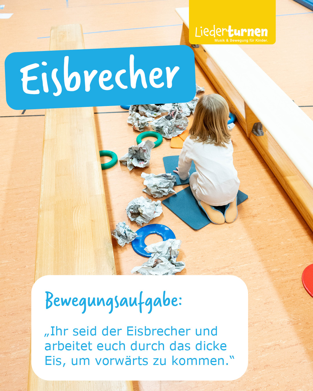 Die Zeitungen als Eisschollen auf dem Boden verteilen, evtl. zusätzliche Zeitungen auslegen. Die Kinder bewegen sich zur Musik nur auf den Eisschollen. Bei Musik-Stopp bleiben sie auf einer Scholle stehen („einfrieren“). Es können Aufgaben gegeben werden, z.B.: auf einem Bein stehen, auf einem Bein hüpfen, als Pinguin einmal um die eigene Achse watscheln, nur der Po berührt die Eisscholle usw.