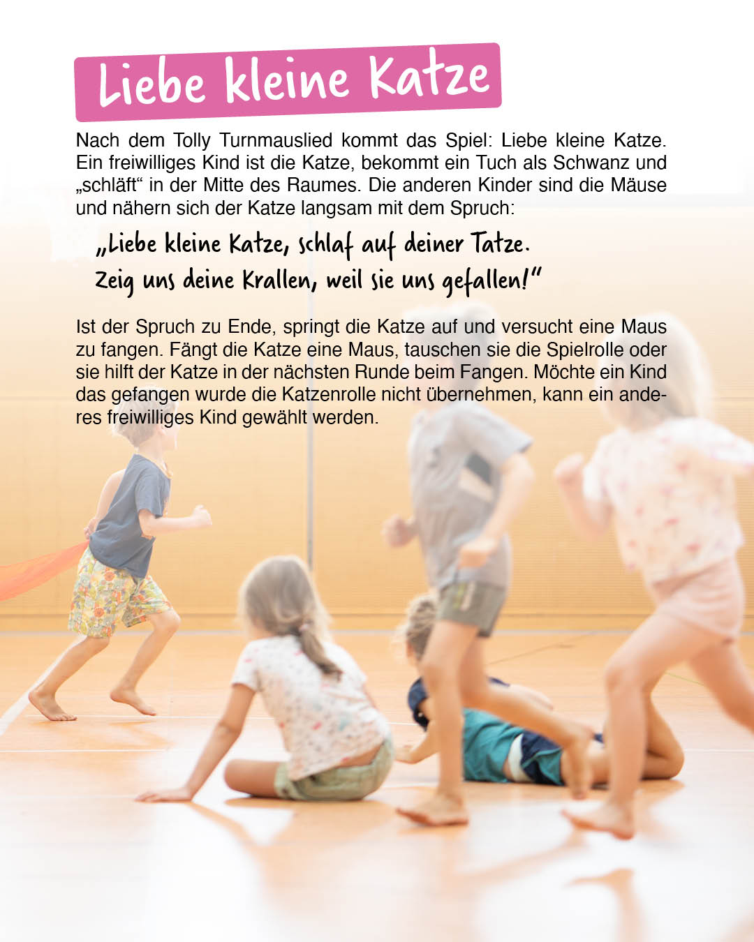 Die Kinder stehen im Kreis und fassen sich an den Händen. Zwei freiwillige Kinder sind Katze und Maus. Die Maus stellt sich in die Kreismitte, die Katze steht außerhalb des Kreises. Sie stellt nacheinander drei Mal die Frage: „Ist Tolly Turnmaus zu Haus?“ Die Kinder, die den Kreis bilden, antworten wie folgt: