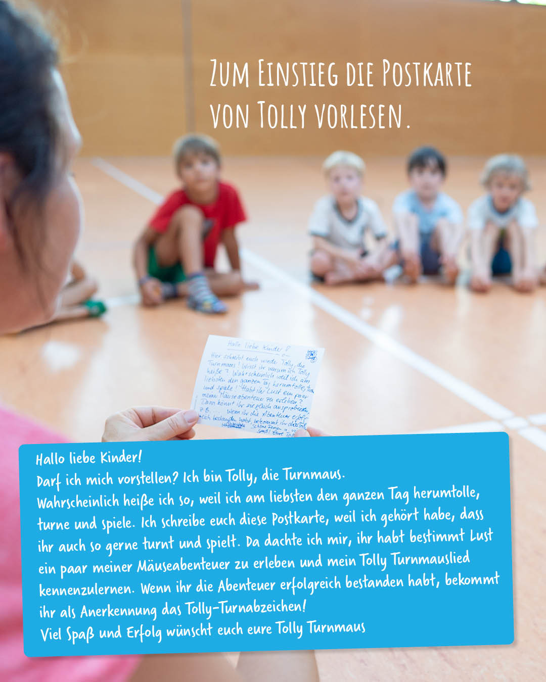 Wahrscheinlich heiße ich so, weil ich am liebsten den ganzen Tag herumtolle, turne und spiele. Ich schreibe euch diese Postkarte, weil ich gehört habe, dass ihr auch so gerne turnt und spielt. Da dachte ich mir, ihr habt bestimmt Lust ein paar meiner Mäuseabenteuer zu erleben und mein Tolly Turnmauslied kennenzulernen. Wenn ihr die Abenteuer erfolgreich bestanden habt, bekommt ihr als Anerkennung das Tolly-Turnabzeichen!