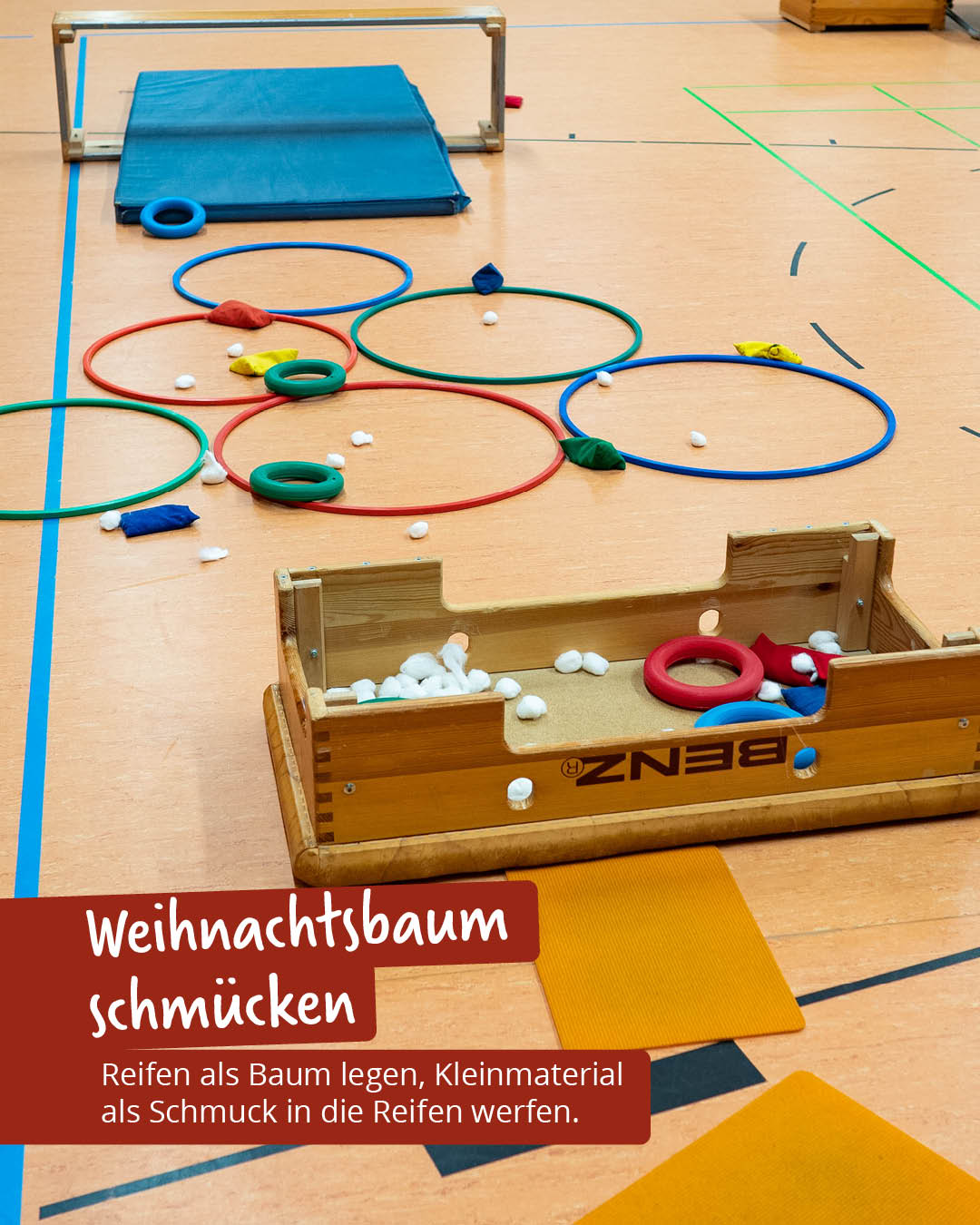 Reifen als Baum legen, Kleinmaterial als Schmuck in die Reifen werfen.