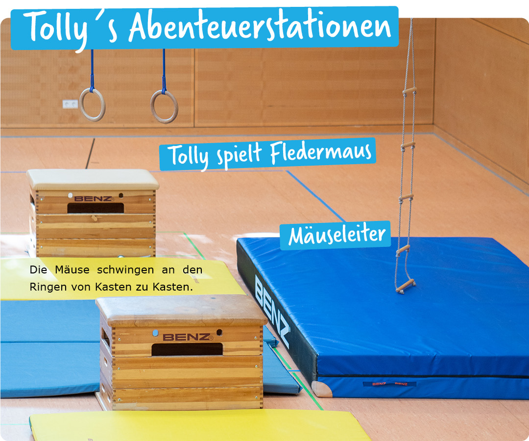 Ihr müsst nur das magische Mäuseloch finden und heineinkrabbeln. Wenn ihr die Abenteuer erfolgreich bestanden habt, seid ihr richtige Turnmäuse und bekommt mein Tolly-Turnabzeichen!
