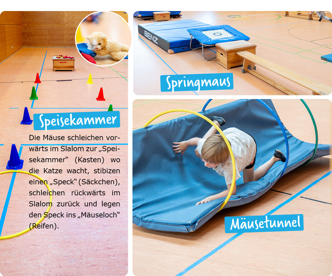 Vorbereitung: An der Startlinie die Turnbank als „Speisekammer“ aufstellen. Darauf die Gegenständen als „Speck und Leckereien“ legen. An der Ziellinie den Reifen als „Mäuseloch“ auslegen und in der Mitte des Spielfeldes den kleinen Kasten umgedreht platzieren.