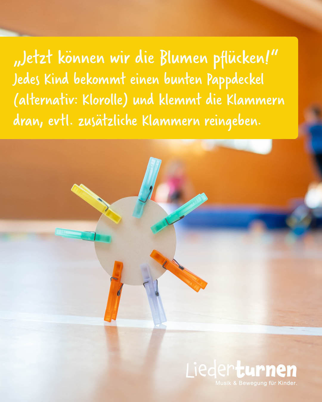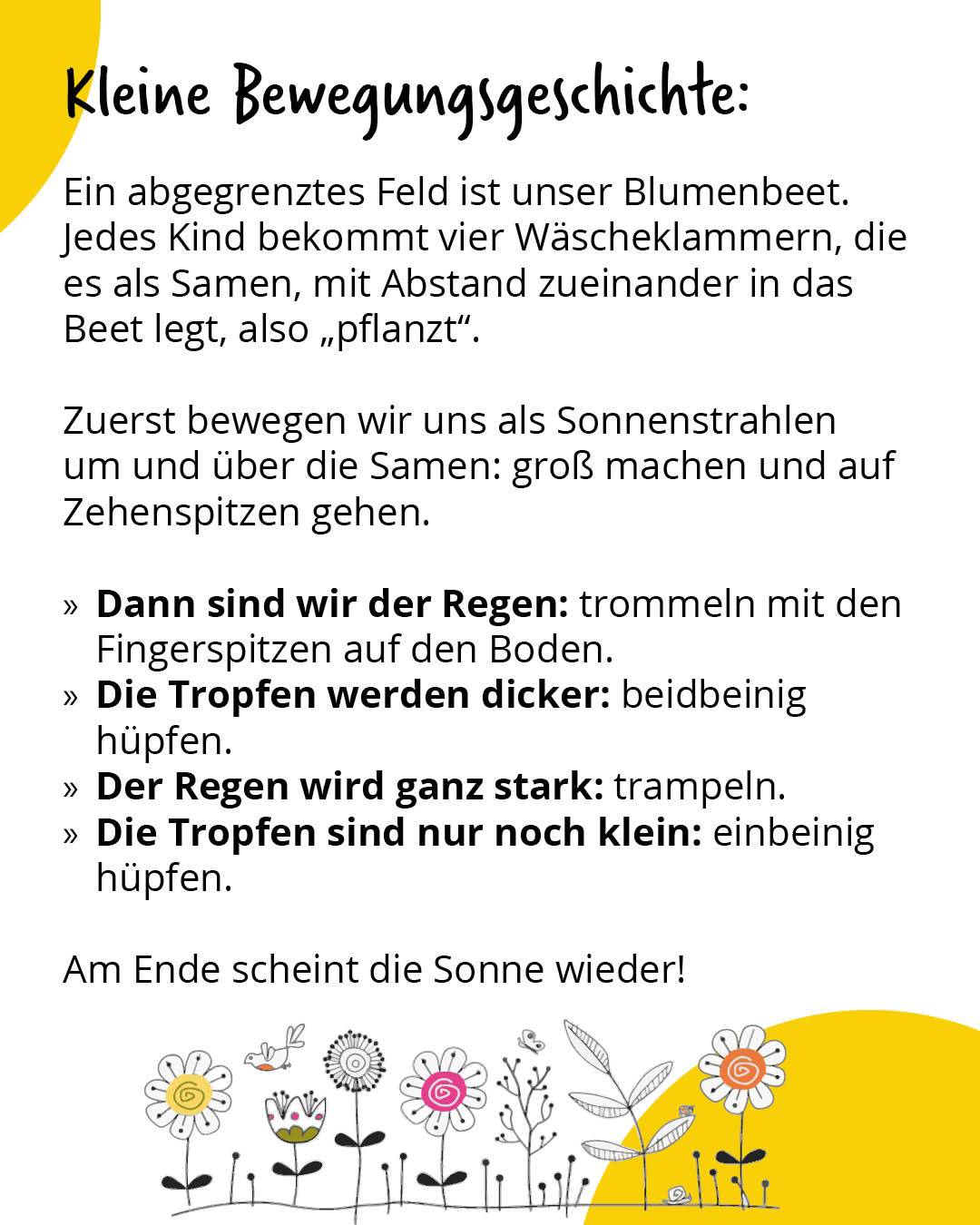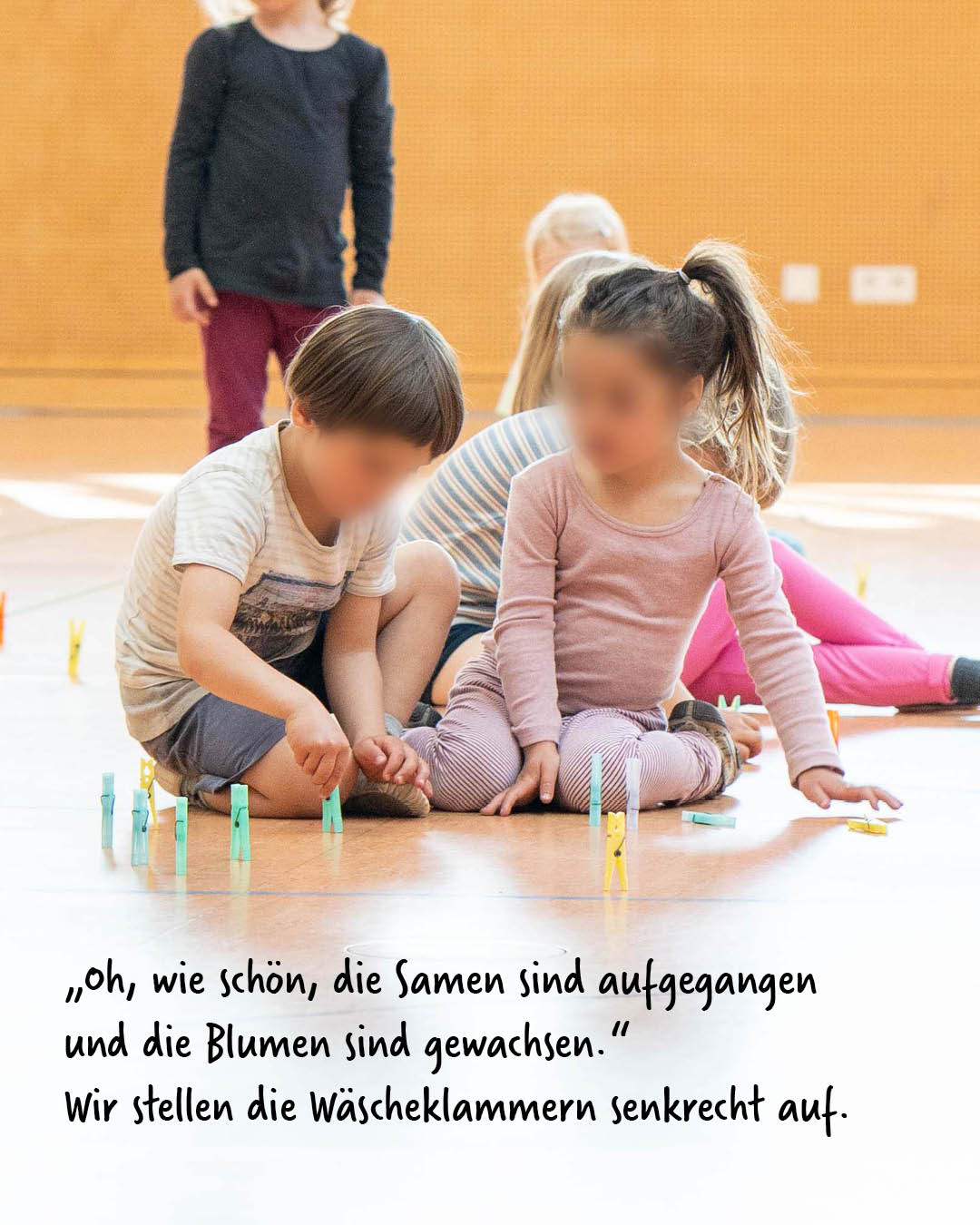 Ein abgegrenztes Feld ist unser Blumenbeet. Jedes Kind bekommt vier Wäscheklammern, die es als Samen, mit Abstand zueinander in das Beet legt, also „pflanzt“.