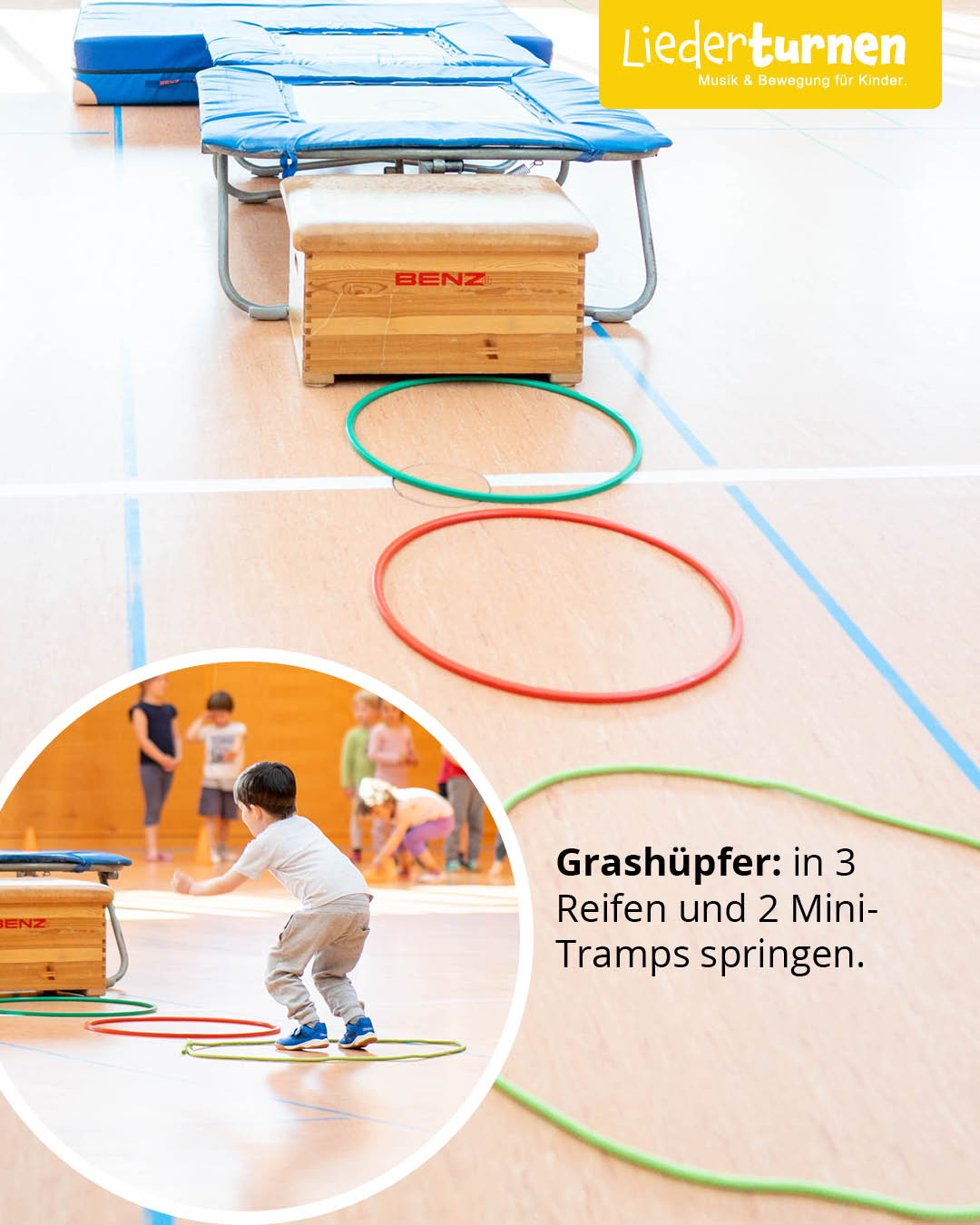 Grashüpfer: in 3 Reifen und 2 Mini-Tramps springen.