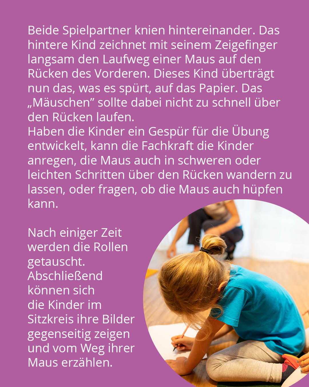 Beide Spielpartner knien hintereinander. Das hintere Kind zeichnet mit seinem Zeigefi nger langsam den Laufweg einer Maus auf den Rücken des Vorderen. Dieses Kind überträgt nun das, was es spürt, auf das Papier. Das „Mäuschen” sollte dabei nicht zu schnell über den Rücken laufen.