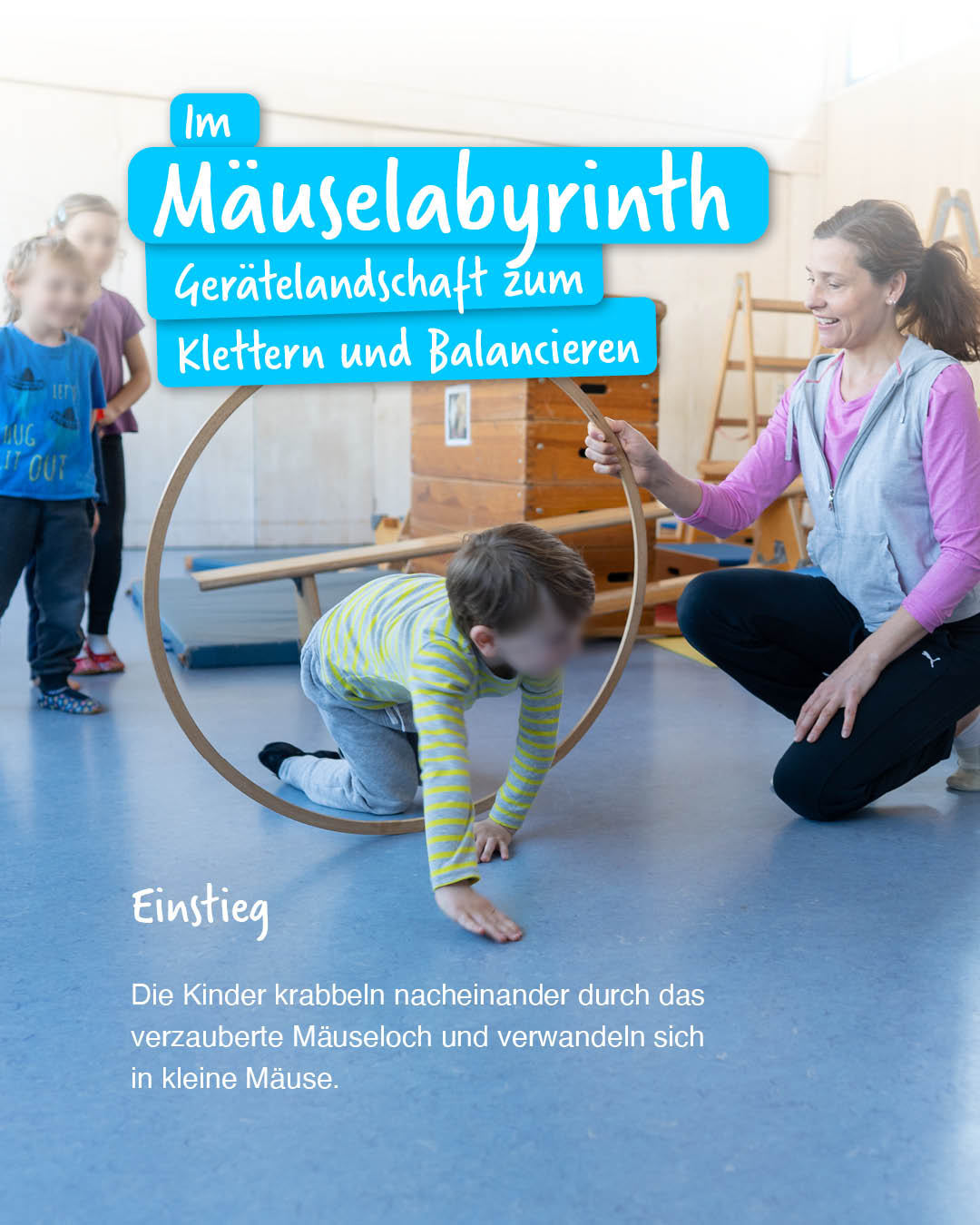 Wie kommen flinke Mäuse in einem Labyrinth aus Leitern, schiefen Ebenen und Turnkästen an ihr Futter? In diesem Parcours verwandeln sich die Kinder in Mäuse und überwinden große und kleine Hindernisse.