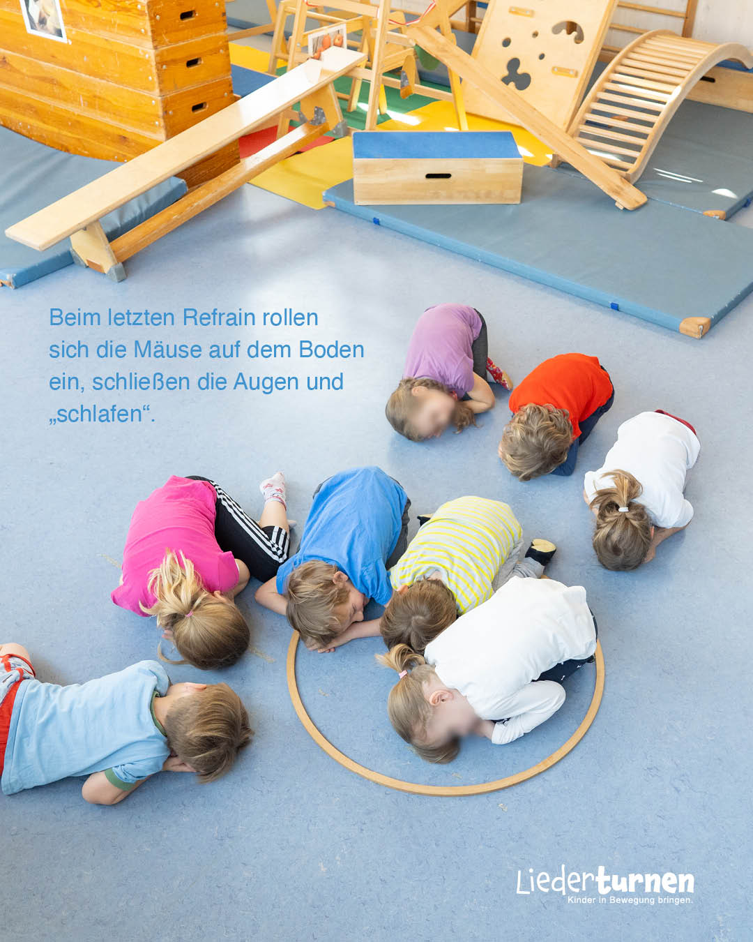 Beim letzten Reim legen sich die Kinder auf den Boden und machen sich klein. Kündigen Sie an, dass die Mäuse jetzt die Augen schließen und einschlafen.