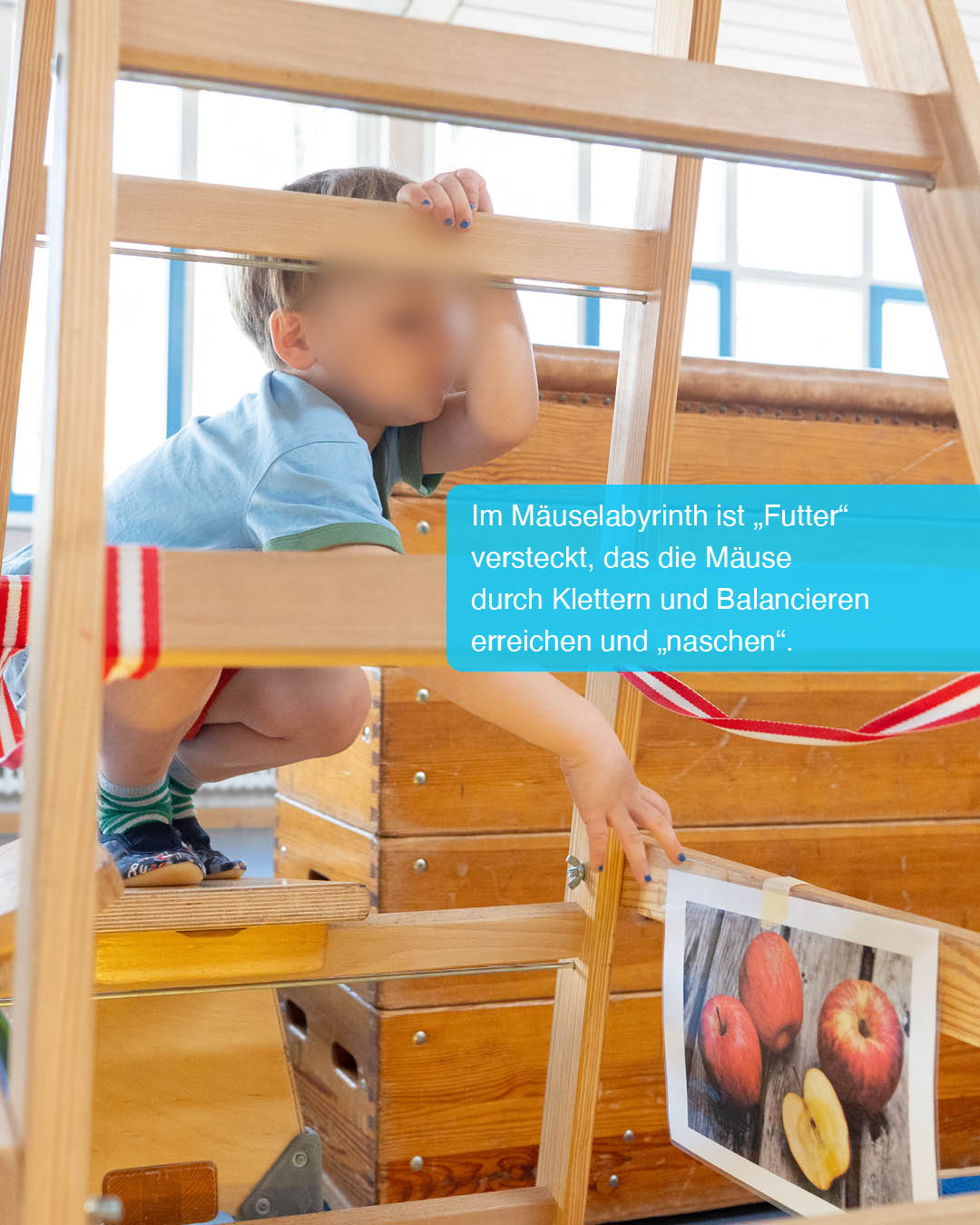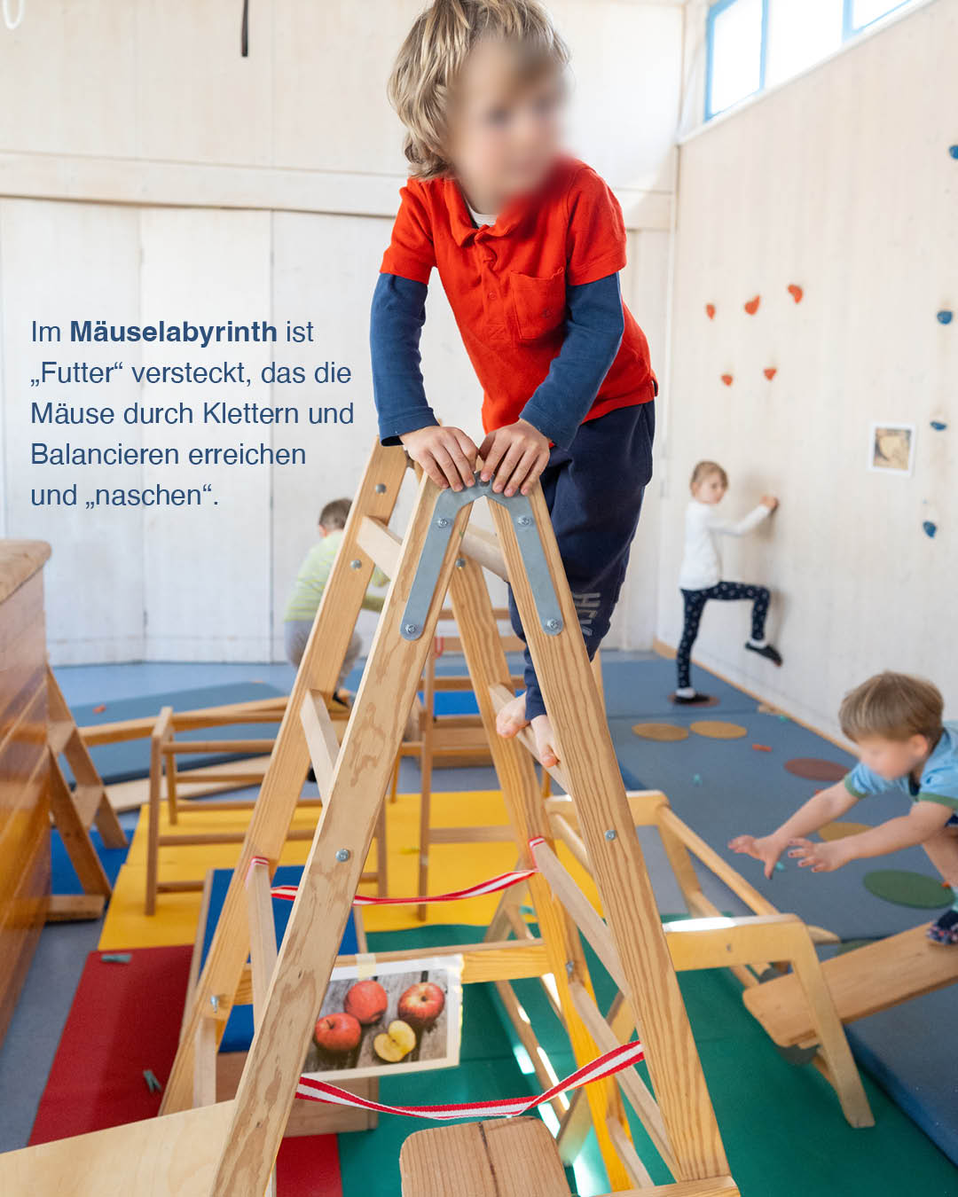 Verändern Sie gemeinsam mit den Kindern die Anordnung der Geräte. Welche Ideen haben die Kinder für den Aufbau des Mäuselabyrinths?