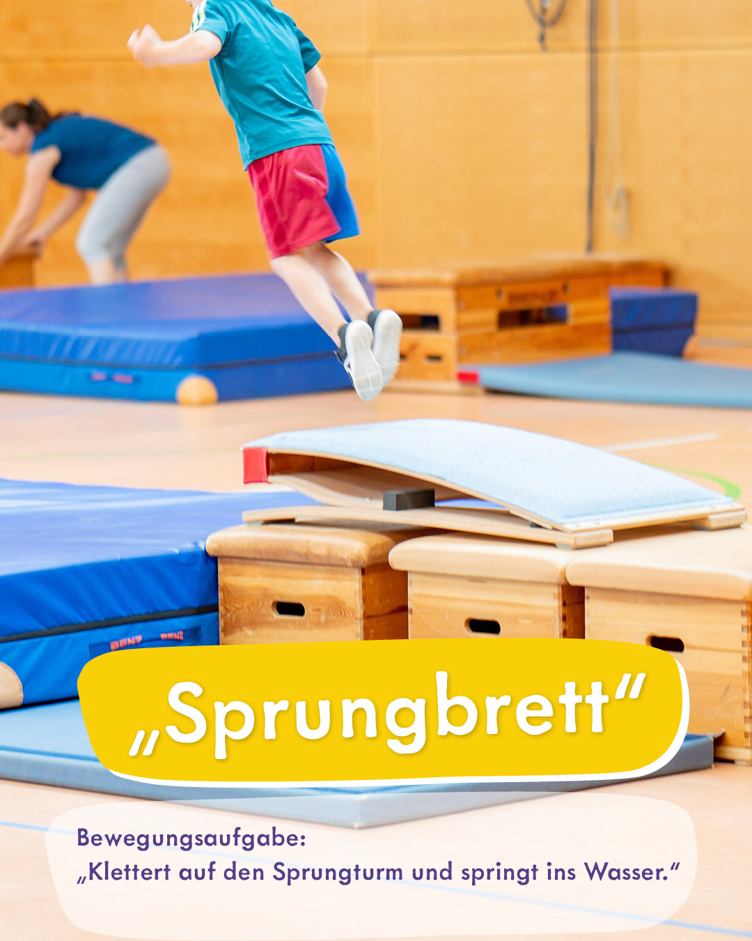Bewegungsaufgabe: „Klettert auf den Sprungturm und springt ins Wasser “