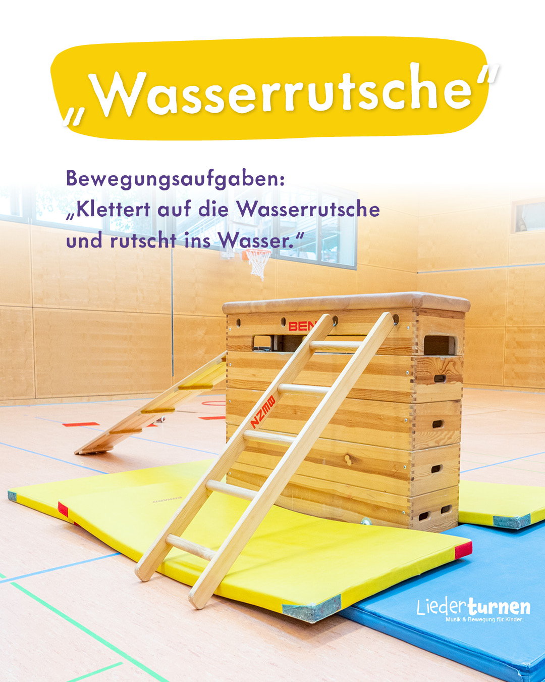 Bewegungsaufgaben: „Klettert auf die Wasserrutsche und rutscht ins Wasser.“