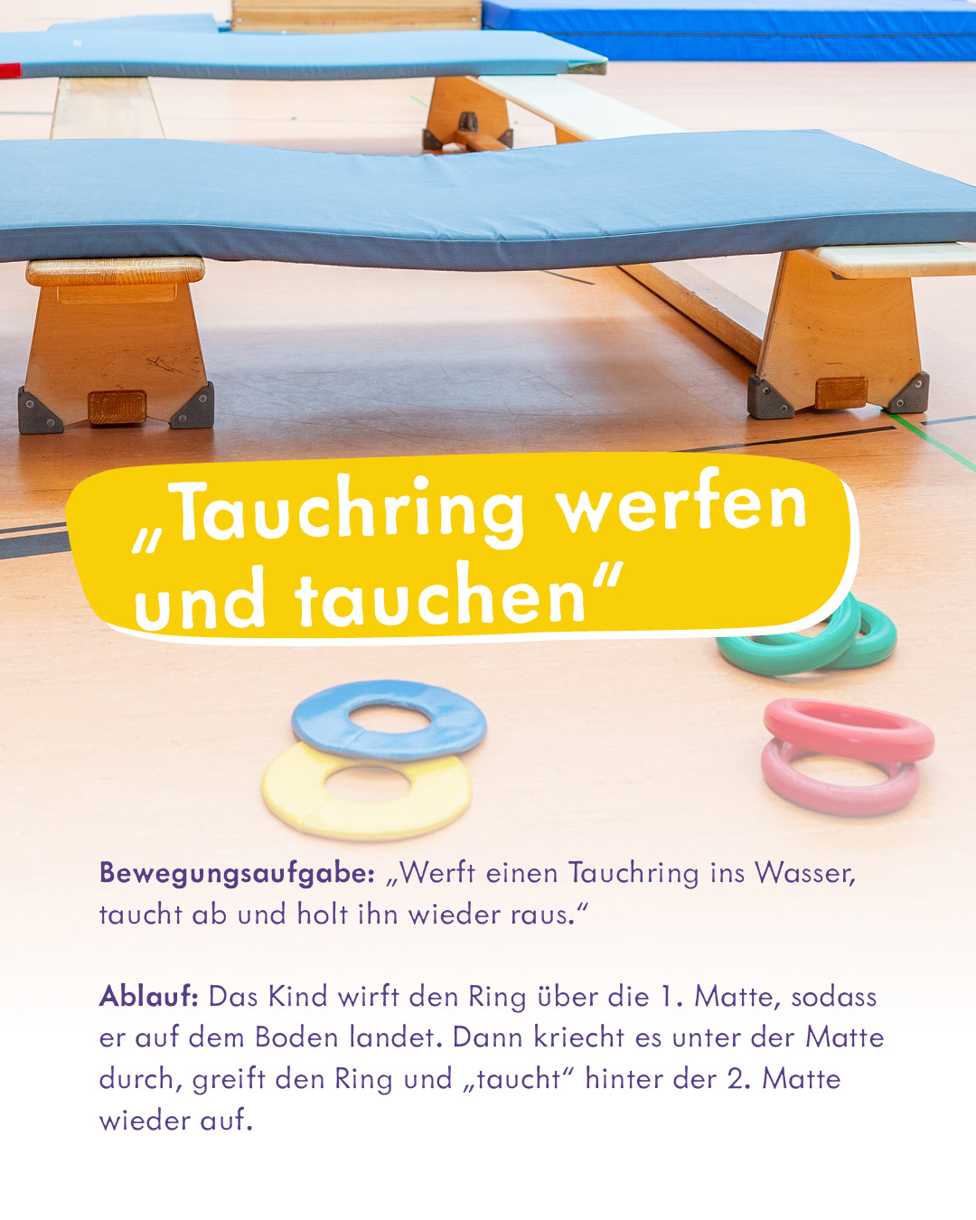 Bewegungsaufgabe: „Taucht unter und findet den Tauchring. Taucht wieder auf und werft den Ring in den Kasten.“ Zusatz: „Schließt die Augen unter Wasser und versucht den Ring trotzdem zu finden.“