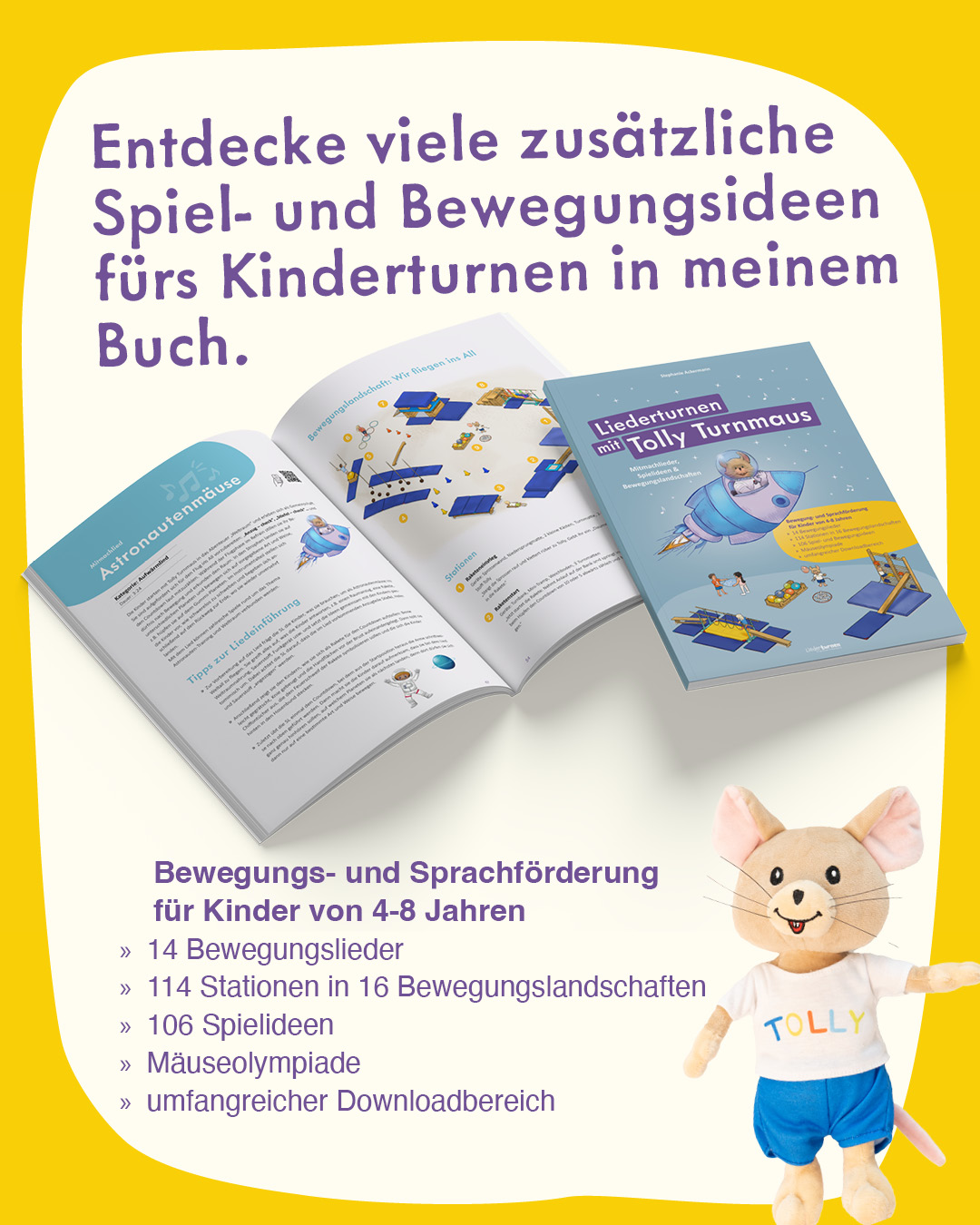 - Material: 2-3 Sprungkästen, 1 Leiter, 1 Rutschbrett (oder Turnbank), 2 Turnbänke, 1 Weichbodenmatte, ca. 8 Turnmatten, 3-6 Tennisringe, 1 kleiner Kasten, evtl. 2 Rollbretter, gelbes Chiffon-Tuch