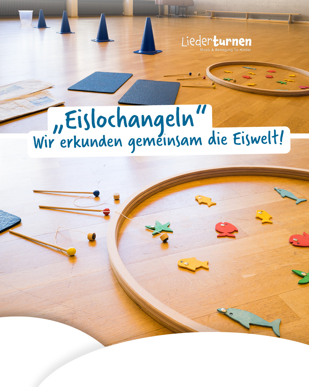 - „Kommt alle zusammen, das Eis wird brüchig und wir müssen von Eisscholle zu Eisscholle springen, um nicht in den See zu fallen!“ Die Teppichfliesen werden auf die rutschfeste Seite gedreht und sind nun die „Eisschollen“. Auf ihnen müssen wir uns jetzt „bis zum Ufer“ bewegen. Dazu einen Bereich als Ufer vorgeben und die Kinder anregen, sich mit den Fliesen den Weg dorthin zu legen, ohne „ins Wasser“ zu fallen.