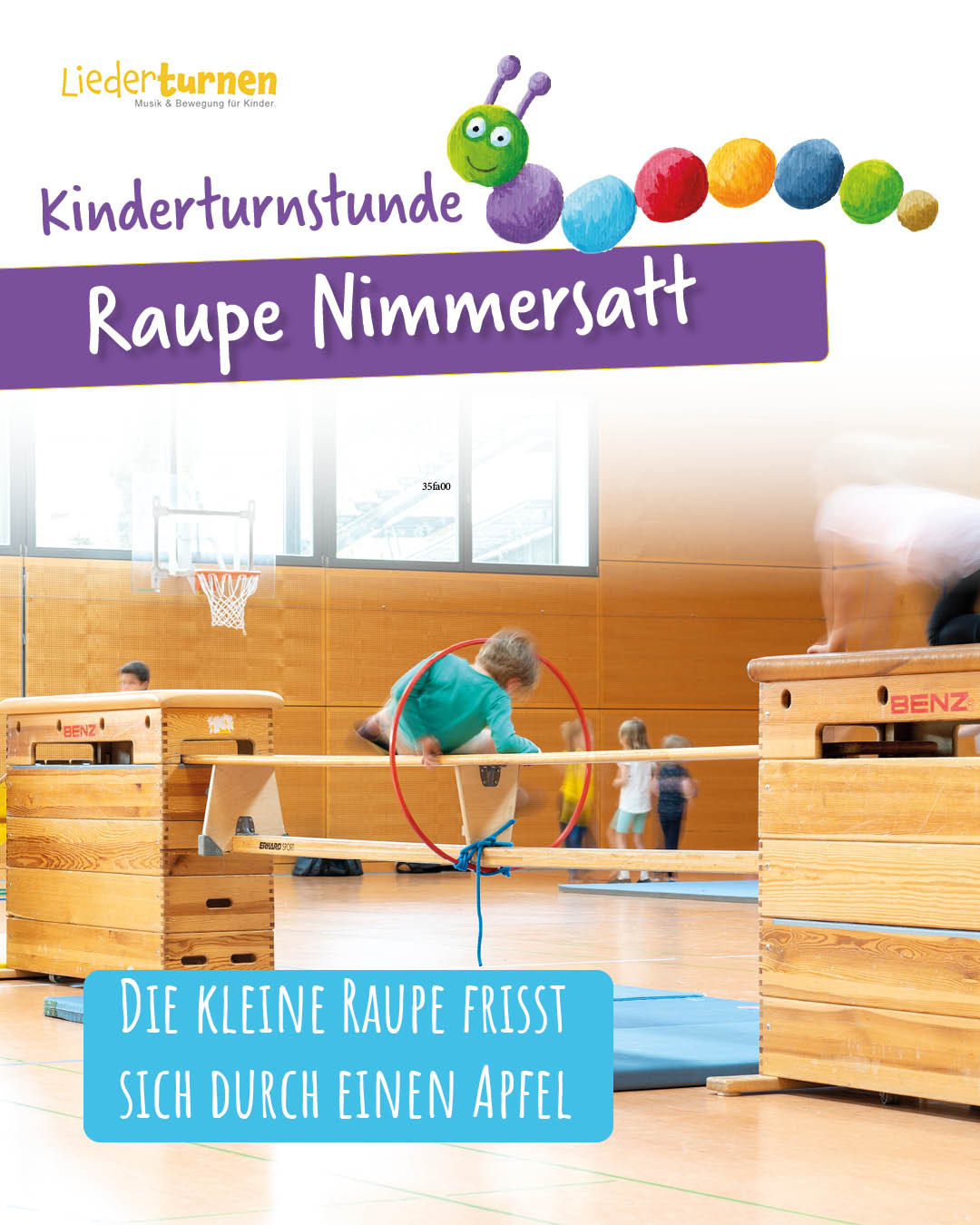 Die Kinder kriechen und krabbeln durch den Raum und "fressen" sich durch einen Apfel, Birnen, Pflaumen, Erdbeeren und Apfelsinen, indem sie durch senkrecht gehaltene Reifen krabbeln.