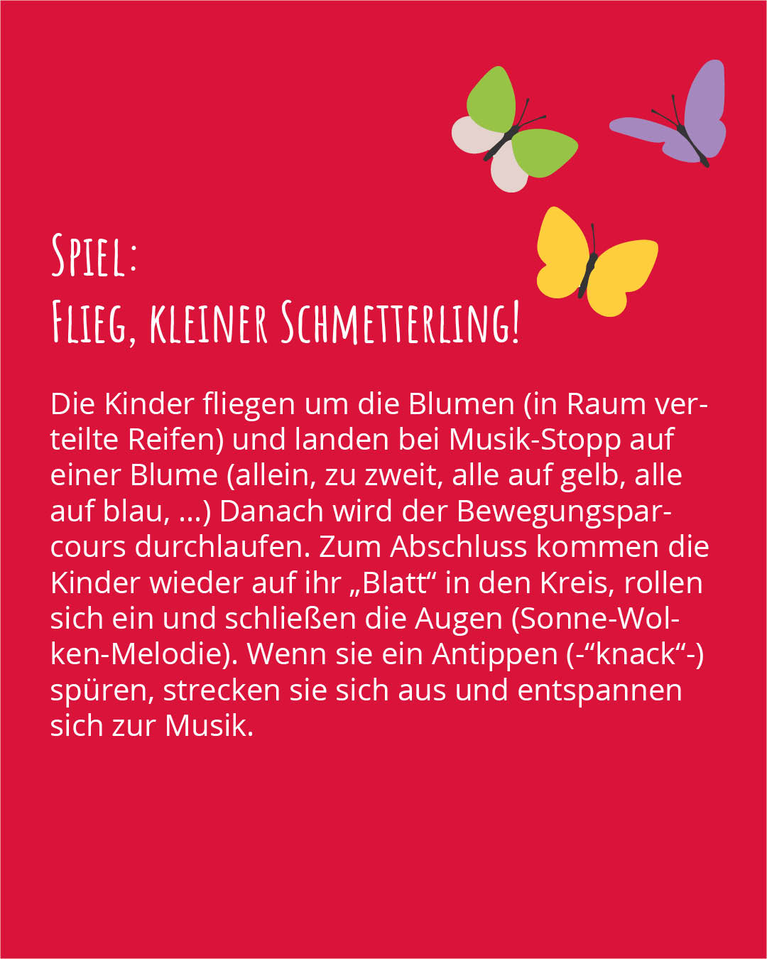 Flieg, kleiner Schmetterling! Die Kinder fliegen um die Blumen (in Raum verteilte Reifen) und landen bei Musik-Stopp auf einer Blume (allein, zu zweit, alle auf gelb, alle auf blau, ...) Danach wird der Bewegungsparcours durchlaufen. Zum Abschluss kommen die Kinder wieder auf ihr "Blatt" in den Kreis, rollen sich ein und schließen die Augen (Sonne-Wolken-Melodie). Wenn sie ein Antippen (-"knack"-) spüren, strecken sie sich aus und entspannen sich zur Musik.