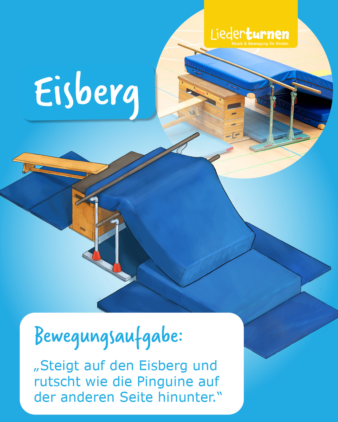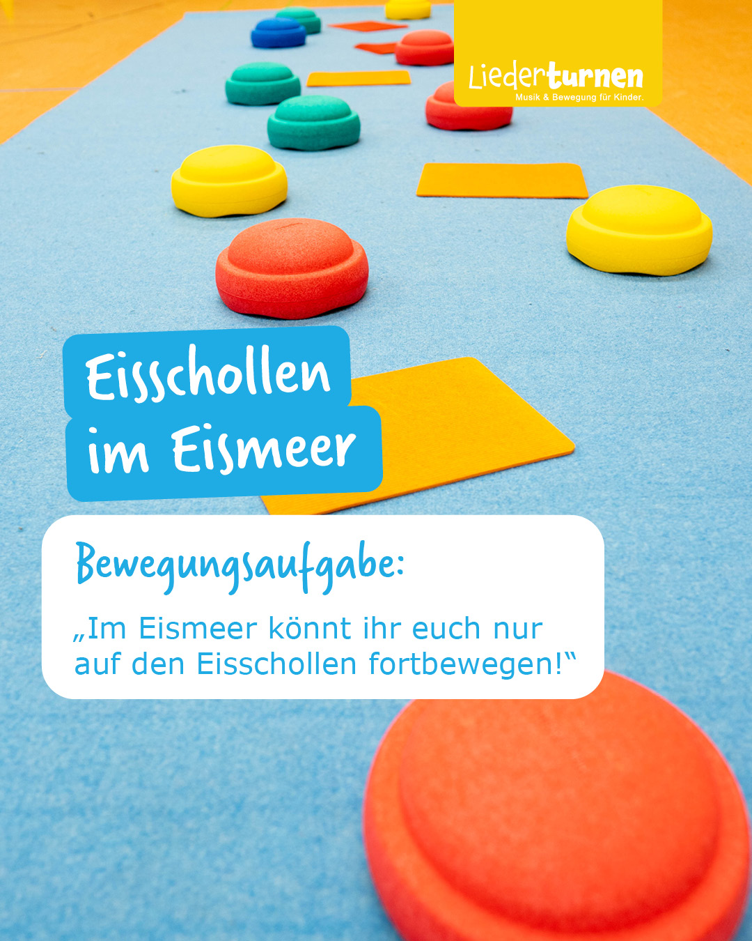 Die Zeitungen als Eisschollen auf dem Boden verteilen, evtl. zusätzliche Zeitungen auslegen. Die Kinder bewegen sich zur Musik nur auf den Eisschollen. Bei Musik-Stopp bleiben sie auf einer Scholle stehen („einfrieren“). Es können Aufgaben gegeben werden, z.B.: auf einem Bein stehen, auf einem Bein hüpfen, als Pinguin einmal um die eigene Achse watscheln, nur der Po berührt die Eisscholle usw.