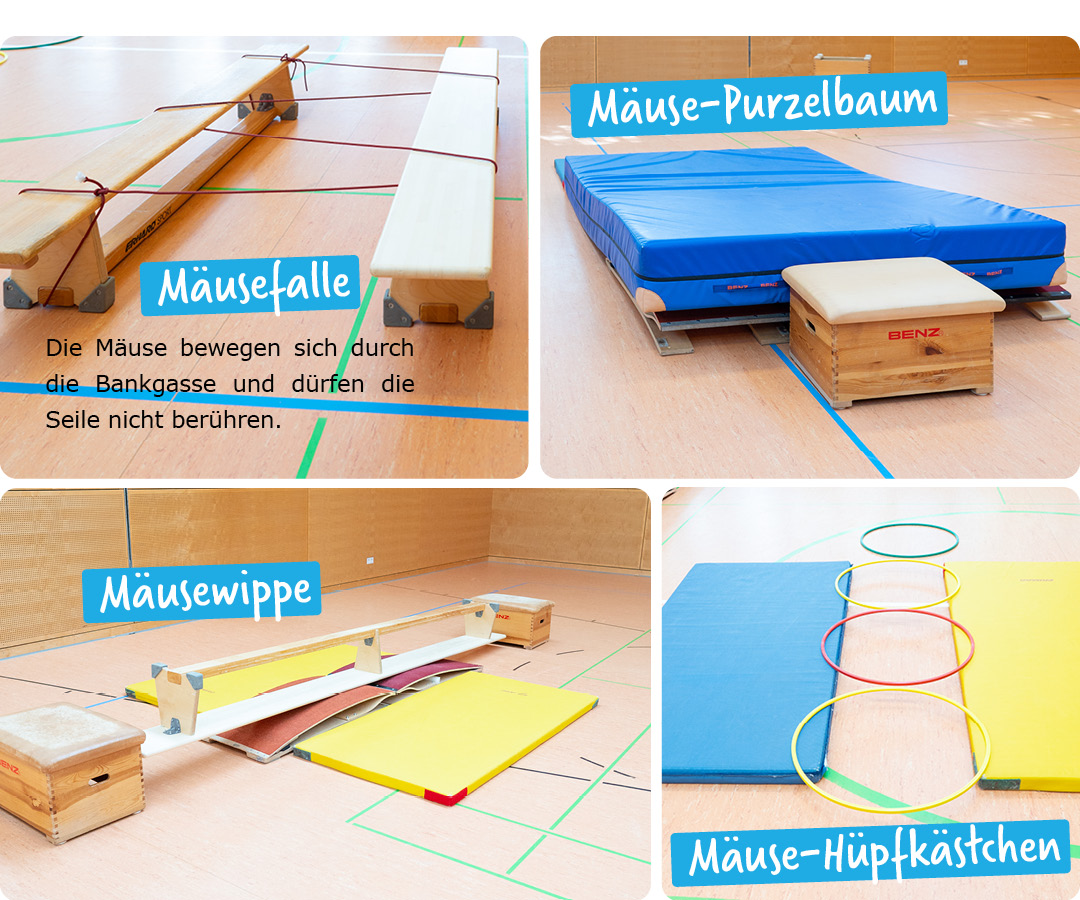 Vorbereitung: An der Startlinie die Turnbank als „Speisekammer“ aufstellen. Darauf die Gegenständen als „Speck und Leckereien“ legen. An der Ziellinie den Reifen als „Mäuseloch“ auslegen und in der Mitte des Spielfeldes den kleinen Kasten umgedreht platzieren.